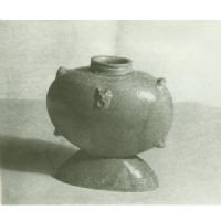 小口,短直頸,扁鼓腹,覆置海棠杯形高圈足.肩及下腹置四對稱牛鼻形系,肩、足部飾小菱形和聯(lián)珠紋帶,腹部兩側(cè)分別以線刻鷺鷥紋各二,周圍襯以二圈聯(lián)珠紋和鋪首銜環(huán)二,底足有"先姑(jia)一枚"銘文.