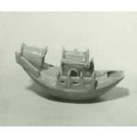 船形,平底,露胎,有倉(cāng)棚和艄棚,倉(cāng)棚船舷兩側(cè)有欄桿,倉(cāng)內(nèi)有人物塑像二尊,著襟衣,為男女二人席地而坐呈交談狀.倉(cāng)棚左邊擱有一木槳,棚頂置有笠帽,右邊一艄公作取笠狀,艄棚略小,船身內(nèi)外施青釉,釉色青亮,露火紅色底胎,船首前有一小洞,注水之用.