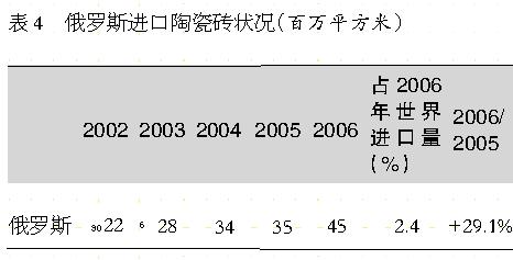 波蘭的陶瓷磚出口量在逐年上升,2006年出口排名全球第13位,而俄羅斯則沒有出口方面的報(bào)道。