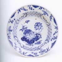 盤折沿,弧壁,腹略深,外壁光素,盤沿上繪各種花卉、竹草,盤中心池塘中綻放著荷蓮,構(gòu)圖疏朗,層次分明。