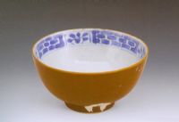 碗撇口,圈足,外壁施醬色釉,碗內(nèi)壁白釉上用青花繪以朵花紋飾。