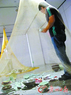 三張懸掛起來的漁網(wǎng),網(wǎng)中攤放著各種瓷器,韓國陶藝藝術(shù)家金光石鉆進(jìn)網(wǎng)中,平靜地將一件件完整的瓷器往地上砸,刺耳的碎裂聲中瓷器碎成片片……11月8日上午,莞城美術(shù)館“反芻”陶藝展覽開幕,開幕式上行為藝術(shù)首次亮相東莞,但不少觀展者都紛紛表示對(duì)這次行為藝術(shù)“沒看懂”。