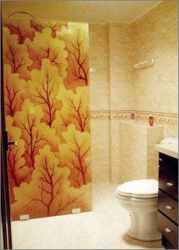 如果你的衛(wèi)生間沒有放置浴缸的空間,而你又不喜歡淋浴房,那么使用這樣一款色彩飽和度高的藝術(shù)玻璃作為沐浴區(qū)的隔斷的確是個聰明的選擇,金黃色的樹葉與墻體、地面的顏色相互輝映,增加了衛(wèi)生間溫暖的感覺。