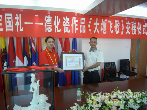 在第五屆中國(guó)東盟搏覽,型取壯族“歌仙”劉三姐的德化云瓷陶瓷有限公司蘇志強(qiáng)作品《大地飛歌》成為搏覽會(huì)指定國(guó)禮,用于贈(zèng)送給東盟各國(guó)家領(lǐng)導(dǎo)人,福建富貴紅文化發(fā)展有限公司也成為本次搏覽合作伙伴。