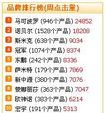 上圖是中國(guó)家居消費(fèi)指南瓷磚品牌排行榜,從前十名不難看出,都是消費(fèi)者耳熟能詳?shù)呐谱,可見品牌與口碑在消費(fèi)者心中的分量。