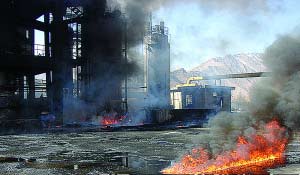 火勢(shì)剛得以控制,距廠房500米處又升起了濃煙。走近一看,原來(lái)有幾名工人正在焚燒院內(nèi)枯草。“原本打算將枯草就地點(diǎn)燃,現(xiàn)在廠房著火了,我們就割下來(lái)放到垃圾箱里燒。”一位工人說(shuō)?吹酱饲榇司,拉薩市公安消防支隊(duì)有關(guān)負(fù)責(zé)人說(shuō),地上有煤焦油和液化氣的混合物,一不小心火苗就能引燃它們,這樣燒枯草,安全隱患很大,工人的消防意識(shí)很淡薄。