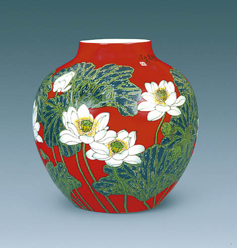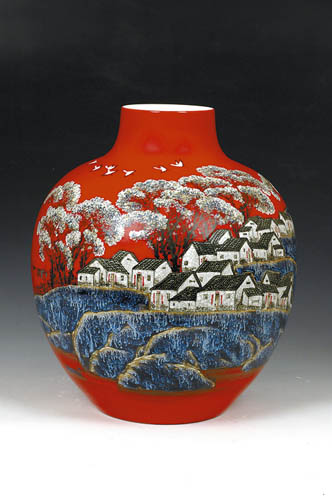 2000年,他到杭州參加“西湖博覽會(huì)暨首屆中國(guó)工藝美術(shù)大師精品大獎(jiǎng)賽”,首次看到國(guó)內(nèi)其它產(chǎn)瓷區(qū)的廠家?guī)淼脑S多件大紅顏色釉參展產(chǎn)品。它們色彩紅亮,顏色誘人,裝飾繪制都是釉上彩。據(jù)來自湖南的參展商介紹,這種大紅釉瓷器叫“中國(guó)紅”,是獨(dú)家首創(chuàng)的陶瓷新品種,經(jīng)過“素?zé)、釉燒、紅燒、金燒”四次燒成,其它產(chǎn)瓷區(qū)根本燒不出。