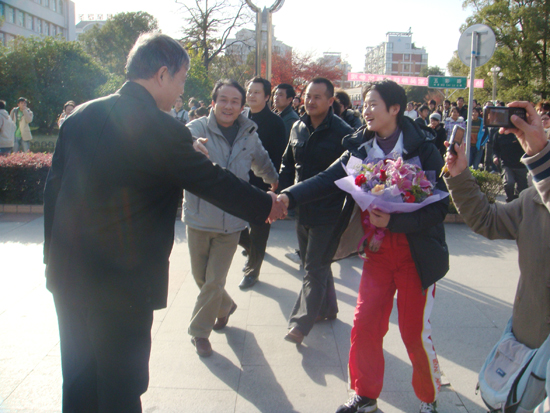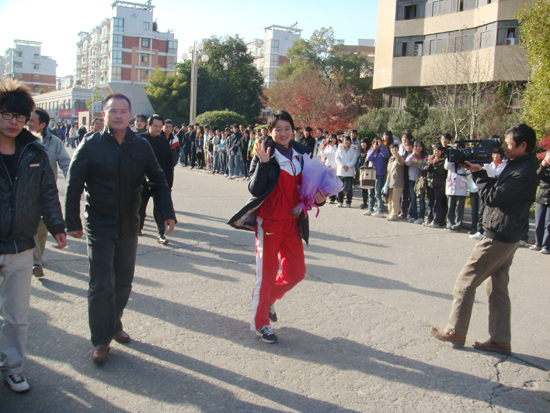 景德鎮(zhèn)在線訊:12月5日下午,北京奧運(yùn)會女子49公斤級跆拳道冠軍吳靜鈺和家人、教練,景德鎮(zhèn)市體育局領(lǐng)導(dǎo)一行來陶瓷學(xué)院參觀,受到了學(xué)校黨委書記肖任賢等校領(lǐng)導(dǎo)和數(shù)百名師生的熱烈歡迎。學(xué)生代表向吳靜鈺敬獻(xiàn)了鮮花,并一致表示“向奧運(yùn)冠軍致敬,向奧運(yùn)冠軍學(xué)習(xí)”。