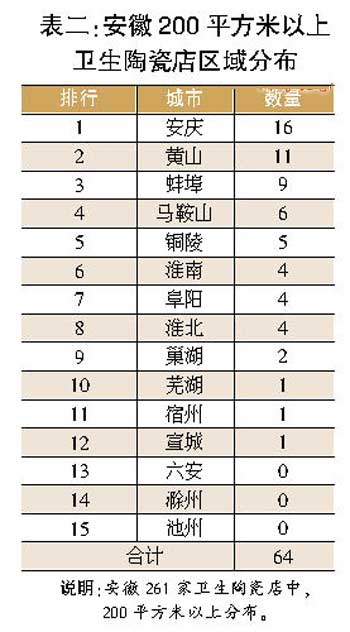 在安徽地級(jí)市場(chǎng)中,恒潔、惠達(dá)、吉事達(dá)、英皇、申鷺達(dá)等衛(wèi)生潔具品牌都有網(wǎng)絡(luò),雖然網(wǎng)點(diǎn)不多,但品牌影響力在這些地級(jí)市場(chǎng)中仍不可小視。在調(diào)查的261家衛(wèi)生陶瓷店中,100-200平方米經(jīng)營(yíng)面積數(shù)量占比近50%(詳見(jiàn)表一),成為地級(jí)陶瓷店的主流,馬鞍山、安慶、蚌埠、黃山等地的衛(wèi)生陶瓷店面積普遍較大,其中,就200平方米以上經(jīng)營(yíng)面積看(詳見(jiàn)表二),安慶仍居首位,黃山尾隨其后。而滁州、池州的衛(wèi)生陶瓷店與建陶店一樣,仍多以較小面積為主。