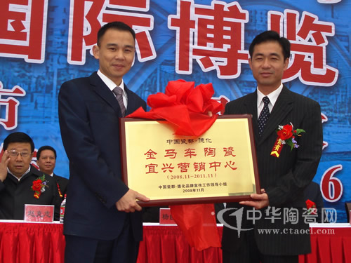圖為德化縣縣長(zhǎng)李輝躍為金馬車陶瓷宜興營(yíng)銷中心授牌