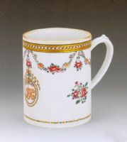 杯子呈直桶形,有環(huán)形手柄,以釉上彩和金彩繪以歐洲風(fēng)格圖案,圍繞開光內(nèi)有字母IH。