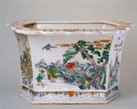 盆通體呈六方形,折沿,沿邊為菱花形,盆身以人物為主題,一面繪《海屋添籌圖》,另五面均繪仙人祝壽等吉祥圖案。