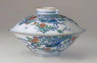 碗撇口,斜壁,圈足。外壁繪斗彩花鳥紋,一喜鵲棲息于梅花和芙蓉花枝上,另一喜鵲展翅空中,蓋呈傘形,蓋面紋飾與碗外壁相同,邊沿處皆描金彩。