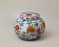罐直口,短頸,扁圓腹,腹下略收,內(nèi)圈足。通體繪山石花卉,以紅、黃、綠、赭、青花等色繪折枝花六朵,數(shù)只彩蝶飛于花間,蓋直口,平頂,蓋面以紅、黃彩繪四朵靈芝。