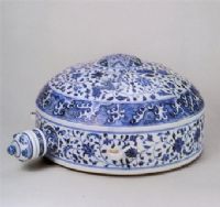 壺直口,一面扁平,中心凹進,一面隆起,隆起面中心有凸臍。蓋圓頂,寶珠鈕。通體青花紋飾,凸臍繪海水江崖地八角錦紋,其內(nèi)飾纏枝花紋,中心四周繪纏枝花紋,外環(huán)以海水紋,壺壁側(cè)繪纏枝蓮紋。