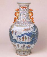 瓶撇口,長頸,鼓腹,腹下漸收,圈足外撇,頸部繪蝙蝠銜雙雨,磬等吉祥物,兩側(cè)置雙螭耳。腹部繪《進寶圖》,人物形象刻畫得逼真?zhèn)魃瘛?/p>