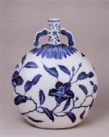 壺直口,細頸,腹扁圓莆,平底。頸、肩處安對稱如意形耳。通體青花紋飾,頸飾纏枝花紋,肩飾蕉葉紋,扁圓腹兩面飾折枝花紋。此器形制源自阿拉伯銅器,器形端莊而穩(wěn)定。紋飾簡潔,以寫生茶花為主體紋飾。