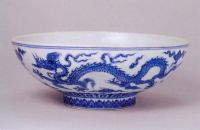 碗敞口,方唇,淺腹。里白釉。外青花紋飾,口飾青花線兩道,壁飾祥云雙龍,近底處飾蓮瓣紋,足墻飾如意云頭紋。
