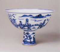 碗撇口,高足中空。外壁繪二仕女對坐賞畫,襯以山水、花草、樹木等,足柄繪山石樹木。碗心青花雙圈內(nèi)書“大明宣德年制”六字楷書。此器紋飾布局疏朗,場面開闊,意境清雅。