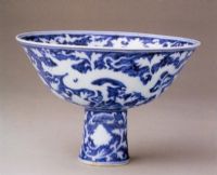 碗撇口,高足中空。里外壁飾青花地留白云龍穿花紋,足柄飾纏枝蓮紋。此器采用青花地留白的裝飾方法,紋飾分外鮮明生動。高足碗多用于陳設(shè)供品。