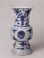 尊撇口,粗長(zhǎng)頸,鼓腹,高圈足外撇,尊兩側(cè)各出三戟。青花紋飾六層,頸飾壽石牡丹,寓意“富貴長(zhǎng)壽”;腹繪蓮花,喻“事業(yè)興盛”。高足分別以祥云,朵蓮,點(diǎn)紋為飾。