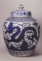 罐方唇口,垂肩,鼓腹,平底。蓋呈天蓋地式,平頂,寶珠鈕,蓋及腹均以青花繪行龍趕珠紋,間飾靈芝托盤“壽”字及海水江崖,朵云紋等,外口沿下青花橫書“大明嘉靖年制”六字楷書款。