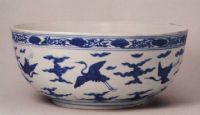 碗直口,弧腹,寬圈足。青花紋飾,口沿下繪纏枝靈芝,壁繪翔鶴,間隙處飾“壬”字云十八朵,底青花雙圈內(nèi)書“大明嘉靖年制”六字楷書款。此器形體碩大豐滿,較為規(guī)整,造型源于明初官窯。