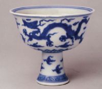 碗撇口,深腹,高足外撇,外壁青花飾雙龍趕珠紋,近足環(huán)飾蓮瓣一周,足墻飾朵云,碗心青花雙圈內(nèi)書(shū)“大明嘉靖年制”六字楷書(shū)款。此件為嘉靖官窯仿“宣青”之器,唯器心署款不同。