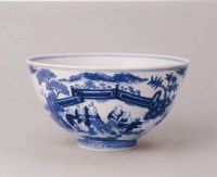 碗敞口,弧壁漸收,圈足。外壁通景青花繪嬰戲圖,一群玩童,或舉荷花,或持長笛,或玩水,空間襯以洞石、欄桿、花草、流云和遠(yuǎn)山,足墻飾回紋。