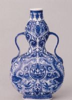 瓶呈葫蘆式,束腰,兩側(cè)飾對稱綬帶耳,圈足。通體青花紋飾,口沿飾變形如意云頭,腹部兩面均繪兩條蟠螭托團(tuán)“壽”字,腹兩側(cè)飾花草,耳飾朵花,足墻飾回紋。