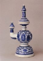 壺呈塔形,口、流均有蓋,曲流與圓腹相連,下承覆體式底托。