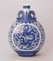 壺唇口,短頸,頸、肩相交處飾對(duì)稱夔鳳耳,扁圓腹,橢圓形圈足。青花紋飾,口沿飾海水,頸飾蕉葉,腹部纏枝蓮開光內(nèi)繪正面云龍,近足處飾蓮瓣紋。
