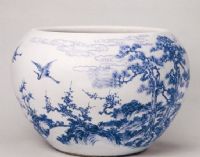 缸斂口,圓腹,臥足。器身通景青花繪《鶴鹿圖》,圖中山巒坡地連綿逶迤,松、竹、梅挺拔茂盛,草木蔥郁;空中有祥云飛鶴,林中有梅花鹿先后相隨。