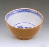 碗撇口,圈足,外壁施醬色釉,碗內(nèi)壁周圈用青花勾繪斜線紋,碗心繪朵花紋飾。