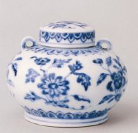 罐小口,短頸,肩兩側各有一圓形小系,扁圓腹,淺圈足,蓋為覆扣式。青花紋飾,主體繪折枝四季花,輔以仰覆蓮瓣紋。