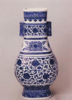 壺方形口,頸飾對稱貫耳,垂腹,方圈足,足側(cè)有用于穿帶的對稱方孔。主體青花紋飾以纏枝花為主,輔以海水、回紋、如意云頭、忍冬、變形蓮瓣紋等邊飾。