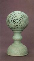 冠架頂部為球狀,頂有一小蓋,托座為俯碗形承托,圈足。通體及足內(nèi)均施松石綠釉,如球狀的頂部鏤空雕纏枝靈芝托如意夔龍紋。托座凸起夔龍紋。枕式。