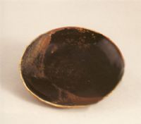盤圓唇,敞口淺腹,圈足。全器飾黑釉,口徑處無釉,為芒口;飾釉均勻,釉色晶亮,黑中泛金星。