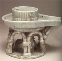胎質(zhì)潔白堅(jiān)硬,通體施青白釉,造型構(gòu)思巧妙,磨齒為幅射狀,中心有圓形漏孔。磨盤為帶流把盤,鏤空仿藤竹編座架,內(nèi)塑一雙公雞,具有濃厚的生活情趣。