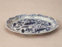 盤口沿外折,為八瓣菱花式,平砂底。盤內(nèi)底主體紋飾是兩束蓮花和一些水草紋,口沿部繪一周卷草紋。整個(gè)花紋簡樸
