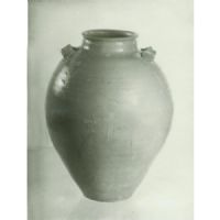 口沿外翻,短直頸,圓肩,鼓腹,下腹斜收,平底內(nèi)凹,肩部橫置寬邊環(huán)耳一對(duì),一耳下方釉下刻官字,制作粗糙,底部露胎.