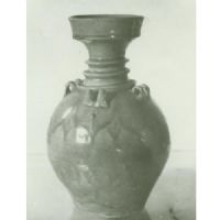 小盤口,長頸,上有二凸輪.溜肩,鼓腹,下腹斜收為小平底.器身肩腹處刻劃有重覆蓮.釉色淡青,開片.較為典型的甌窯產(chǎn)品.