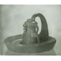 燈盤圓形,口外撇至口沿又向內(nèi)斂,底盤正中有一牛型油管,頂上和末端后壁均有方孔,可插燈芯。后面有彎曲把手,象征牛尾。牛的四肢上下并列,嘴及雙眼略施褐色點(diǎn)彩,釉色青黃,開冰裂紋。