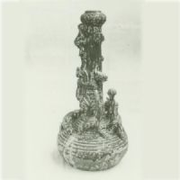 夾砂褐胎,釉不及底,頭部作蒜頭狀,竹節(jié)形長(zhǎng)頸,扁圓腹,平底,頸部堆塑一人擁抱瓶的頸部,作攀登狀,背面一人倒立,兩手搭著攀者的右臂,周緣三獸頭相間五飛禽.上腹部飾凹弦弦紋數(shù)周,一人左手執(zhí)棒,右手牽一虎,另一人側(cè)視,左手執(zhí)棒,右手牽龍,,龍虎之間,各塑一引頸巨禽.