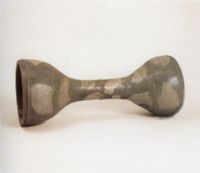 此鼓中間為圓柱,兩頭為喇叭口,如朝鮮婦女使用的腰鼓,中間圓柱上有三條弦稜,兩端口部各有一條弦稜,此稜便于固定鼓面。瓷鼓通過施黑褐色釉,灰白色花斑,灰色胎,胎質堅硬,據(jù)近幾年考古發(fā)掘得知,此鼓為耀州窯所制。從陶瓷史來看,在河南燒此種花釉較多,如河南密縣、扒林窯,魯山窯等,以魯山窯燒此鼓最名,稱魯山花鼓,此鼓與魯山花鼓相近,造型略有差別,為耀州窯提供了可貴資料。