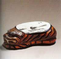枕形呈臥虎形象,虎背平坦作枕面;姨ィ┌咨瘖y土。枕面作腰圓形,內(nèi)以黑彩繪蘆塘鹡鸰圖,具典型中國寫意畫風(fēng)格,筆法瀟灑自如。虎頭及身以黑彩描繪毛發(fā)和斑紋,除眉、眼、口、牙幾處用極淺而薄的褐色輕涂外,余皆罩以較深的褐色。