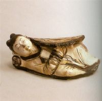 枕整體雕塑一童子側臥于圓枕之上,安然入睡。枕面如意云頭形,覆蓋童子身體。通體白釉褐黑彩彩繪,童子頭梳雙髻,雙手合攏,懷抱書卷,眉清目秀,一臉稚氣,姿態(tài)自然優(yōu)雅。