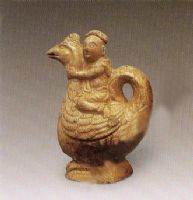 胎白質(zhì)細(xì),釉白泛灰,釉厚處發(fā)黃綠,底有流釉現(xiàn)象。陶塑呈壺型為雞狀,雞嘴為流,雞尾向上彎曲為壺把。