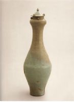 瓶平口短頸,圈足帶蓋。蓋呈笠帽狀,寶珠形鈕,邊緣設三圓管狀小系。器腹上部強長束腰,下部呈腰鼓狀。頸部設三圓管狀小缶。通體施青白釉,呈色泛青;圈足素胎。