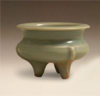 胎體灰白,堅硬。施粉青釉,釉面光滑,色澤青淳滋潤,有玉質(zhì)感。平口,短頸,扁腹。腹底有等距離三足,呈三足鼎立。